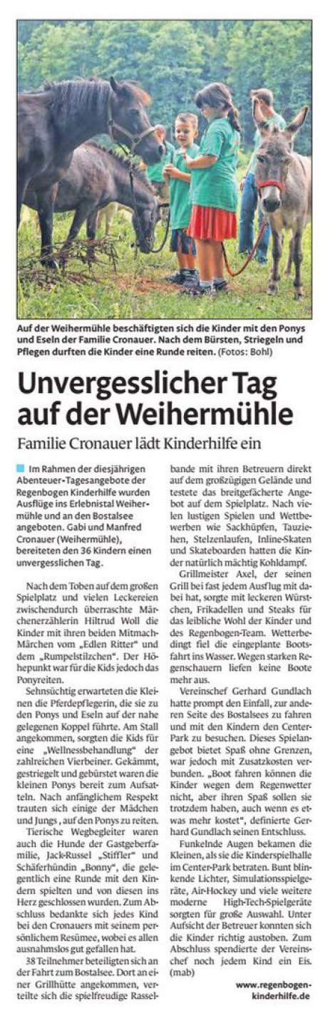 Wir unterstützen die Regenbogen-Kinderhilfe mit einem Abenteuer-Ferientag im Weihermühle-Erlebnistal.
